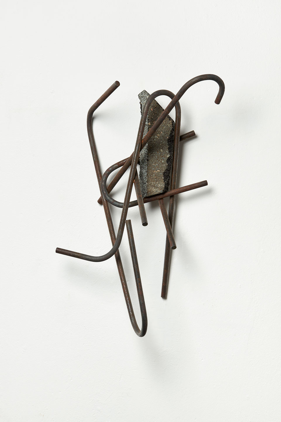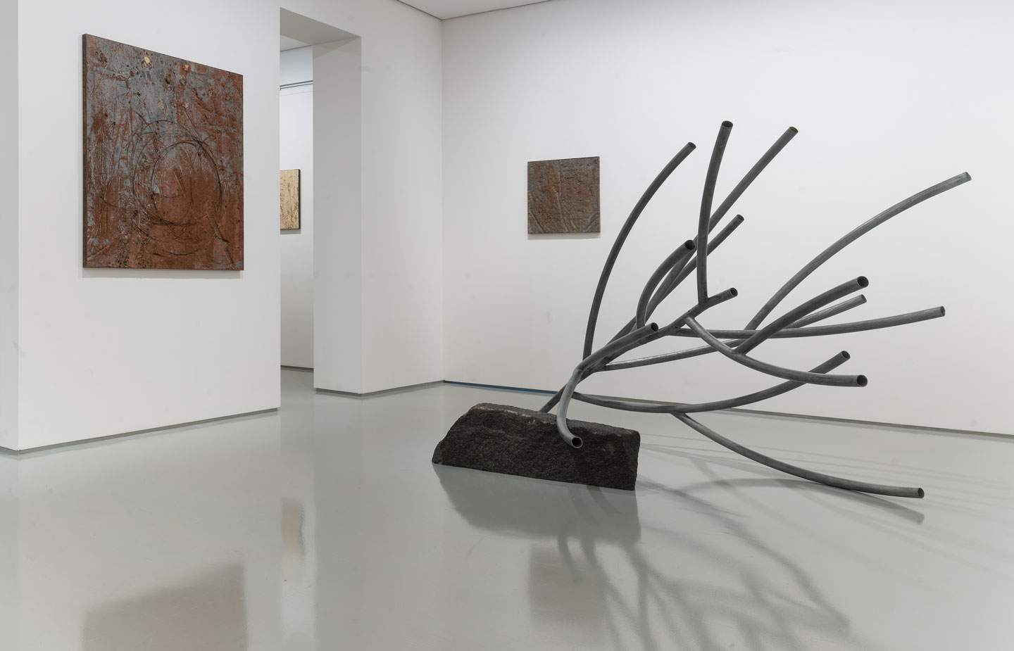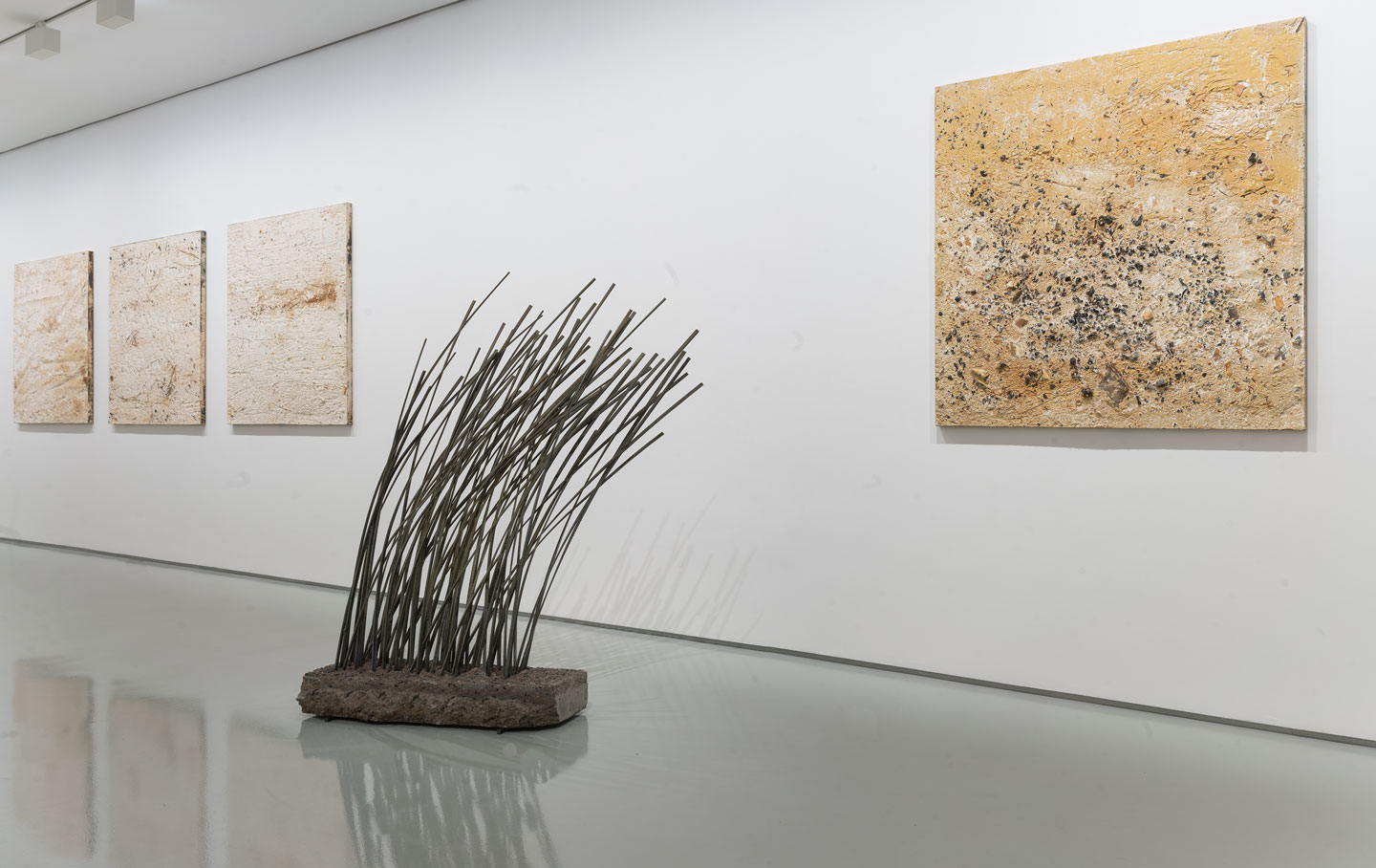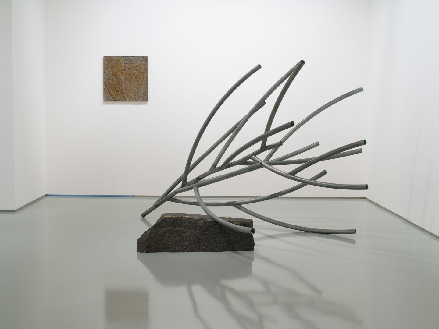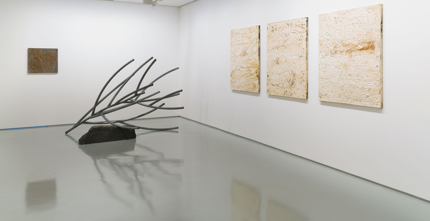 Mathison works his reliefs by recycling the discarded aggregate, eroding away lighter material in a manner that mimics both the manufactured processes of extraction and the natural weathering of the landscape. In addition to the human activities that rapidly shape rock and soil are the forces of nature, of wind and water, playing out over longer periods of time. He plays on this ambiguity in both the panels and in the sculptures that accompany them: tree branches, grasses and futurist compositions made from industrial metal bar and tube.