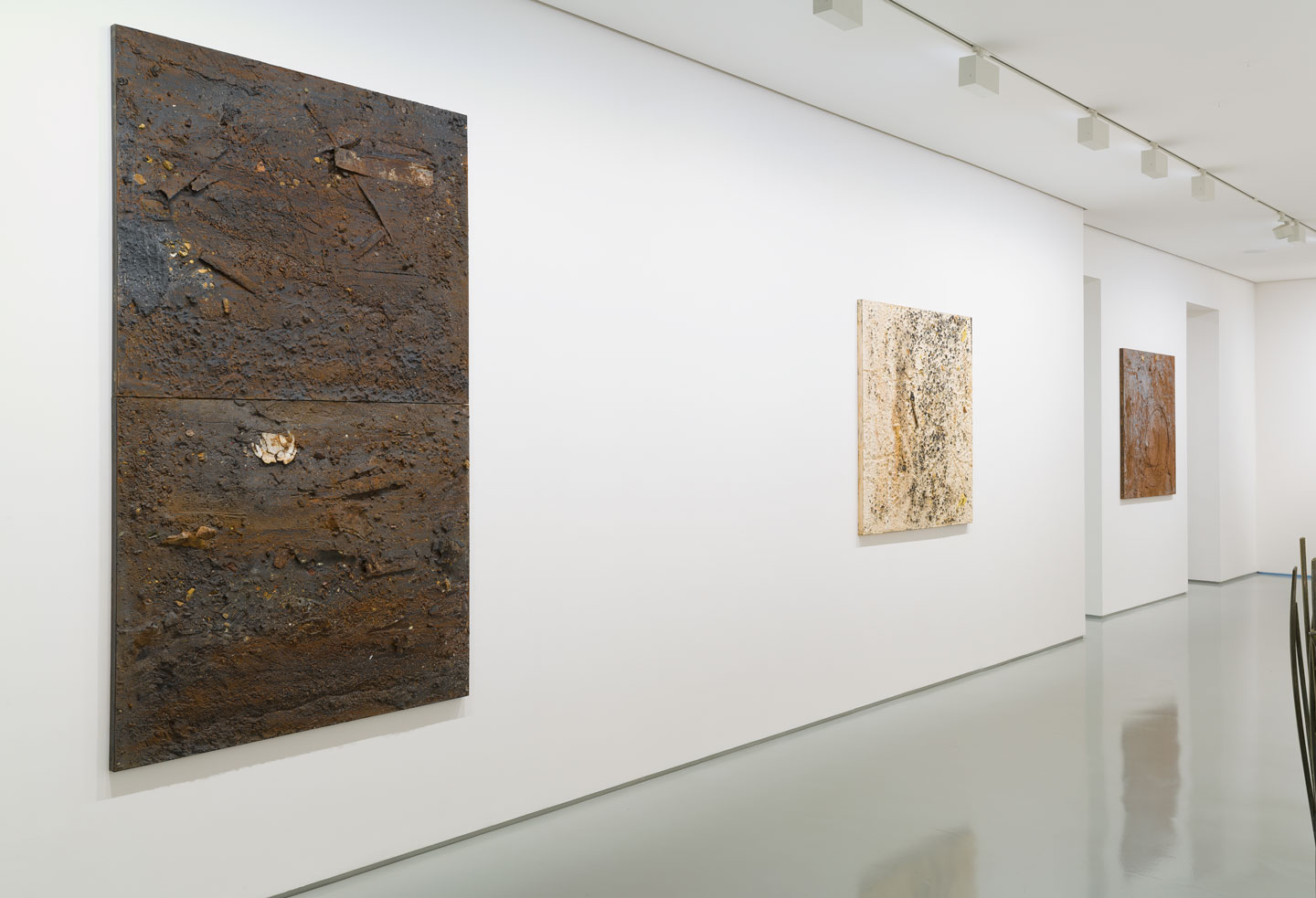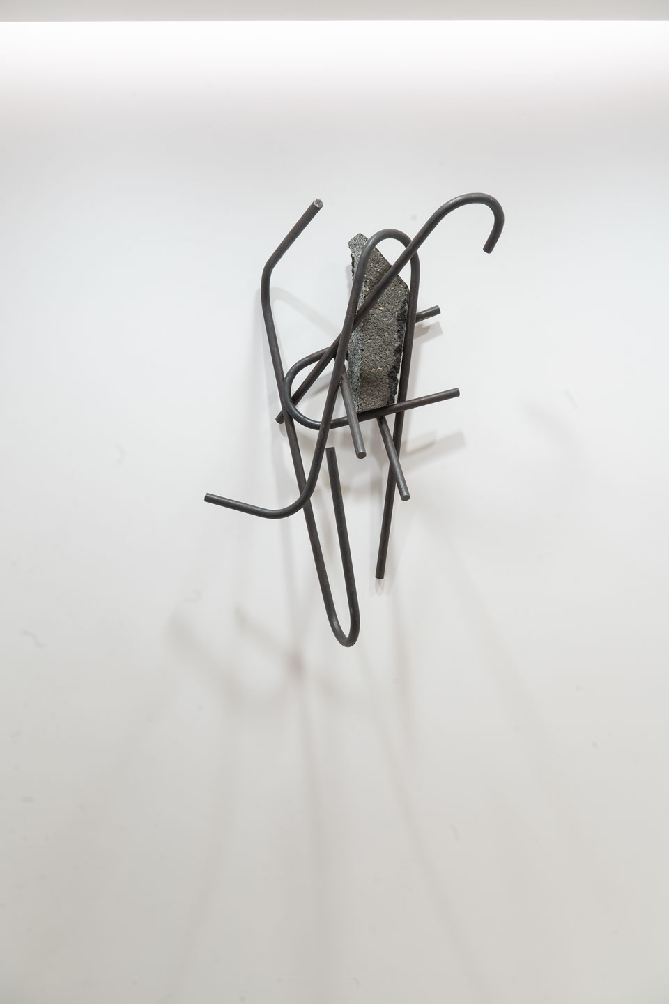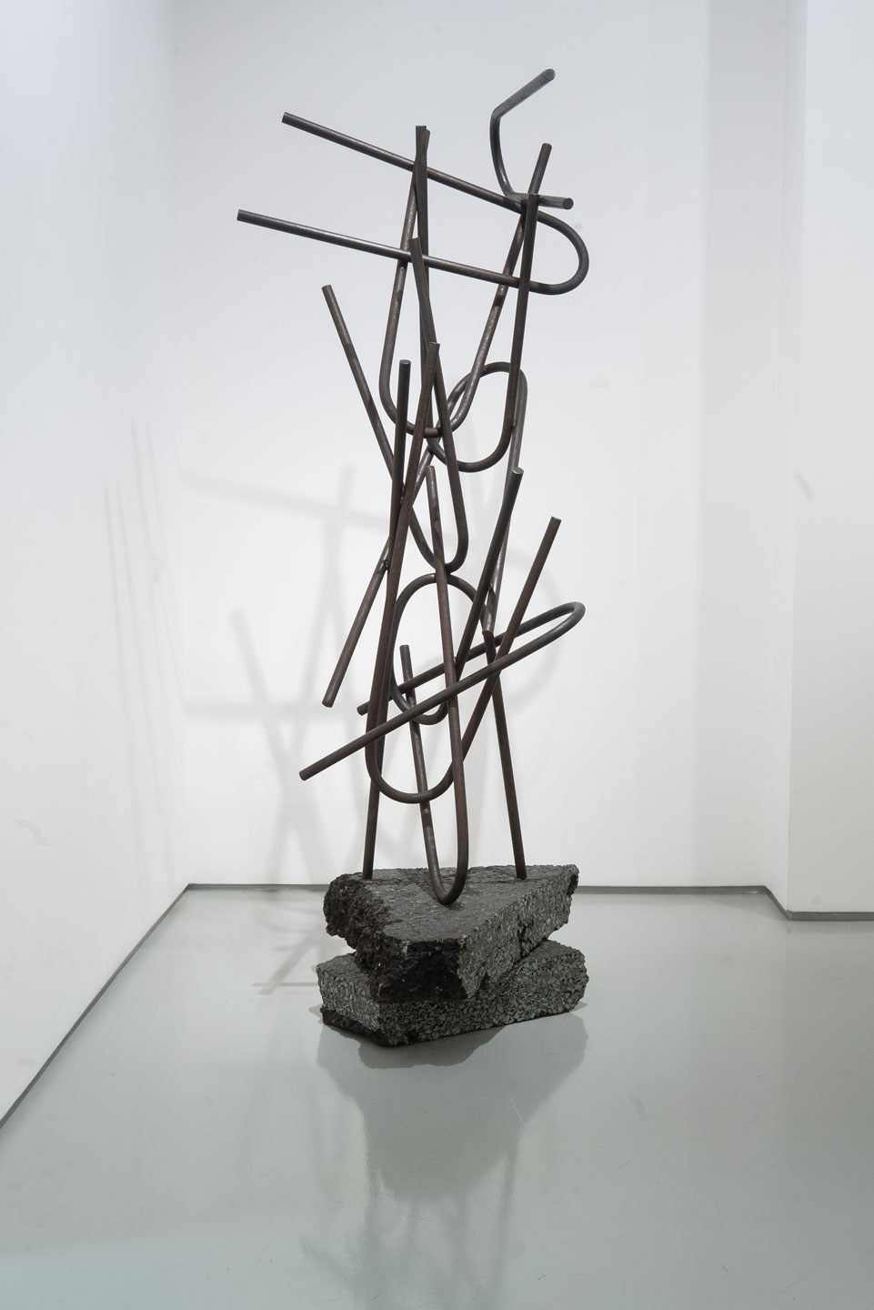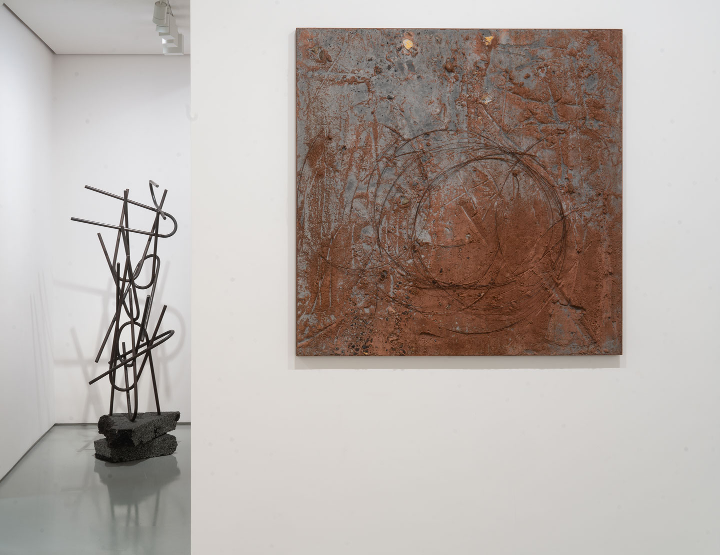 Mathison works his reliefs by recycling the discarded aggregate, eroding away lighter material in a manner that mimics both the manufactured processes of extraction and the natural weathering of the landscape. In addition to the human activities that rapidly shape rock and soil are the forces of nature, of wind and water, playing out over longer periods of time. He plays on this ambiguity in both the panels and in the sculptures that accompany them: tree branches, grasses and futurist compositions made from industrial metal bar and tube.