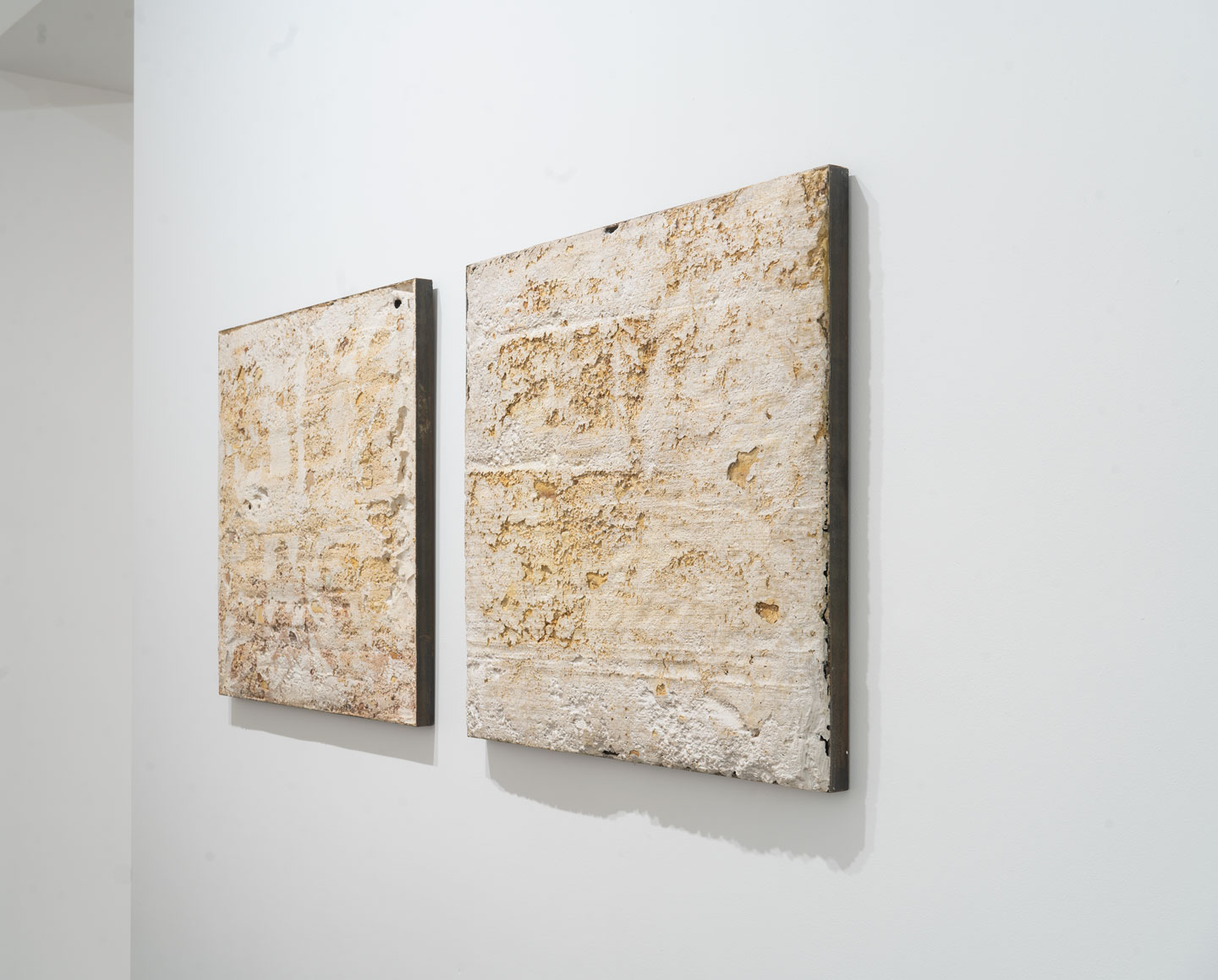 Dissolution features a range of works that incorporate the remnants of these mining activities. Wall-mounted relief panels that reconstruct the ground from these landscapes combine with steel sculptures that echo the surrounding vegetation and broken infrastructure. Like Borges’ map that grew to the size of the territory itself, these extractions from the landscape can be seen simultaneously as one-to-one depictions or aerial views of the same ground. There are echoes of an archaeological or forensic approach to laying a grid on the landscape, recording and focusing in on a square at a time to see what is revealed in it.