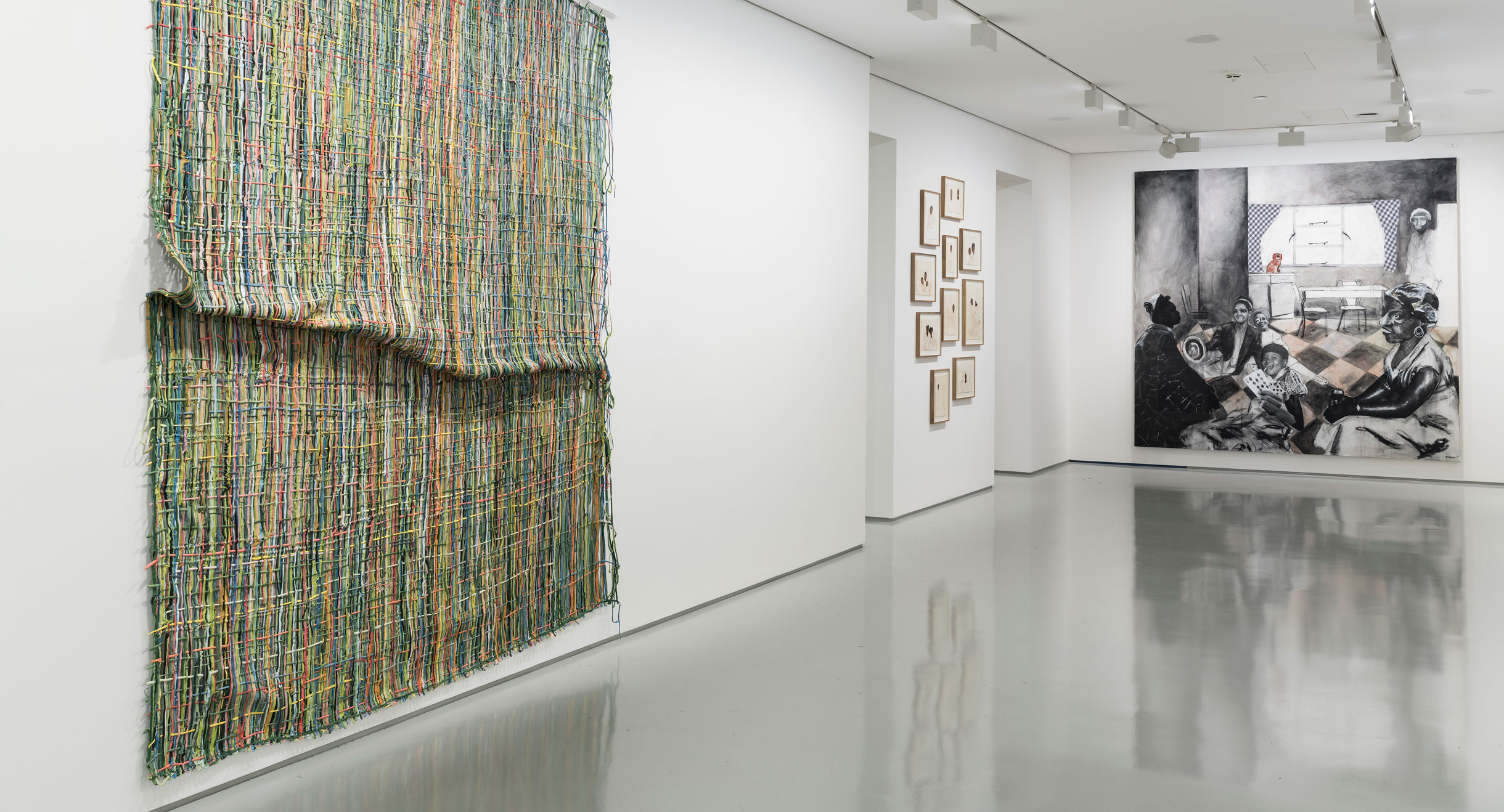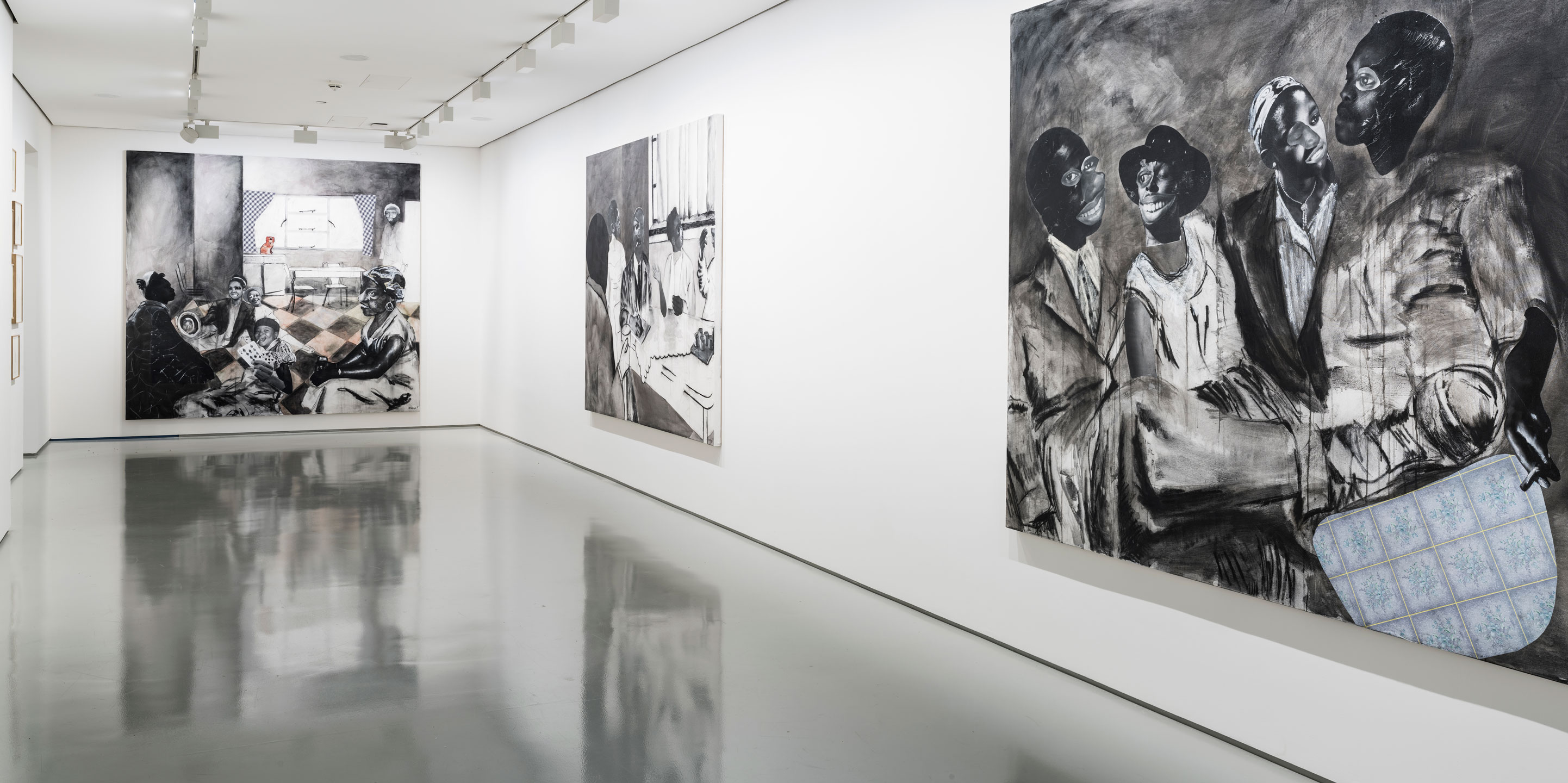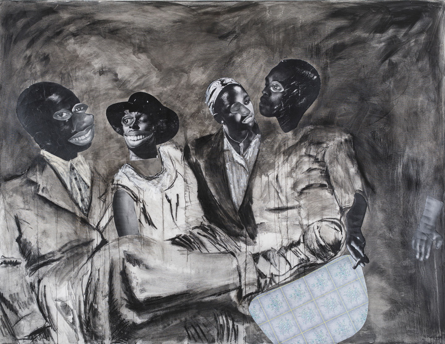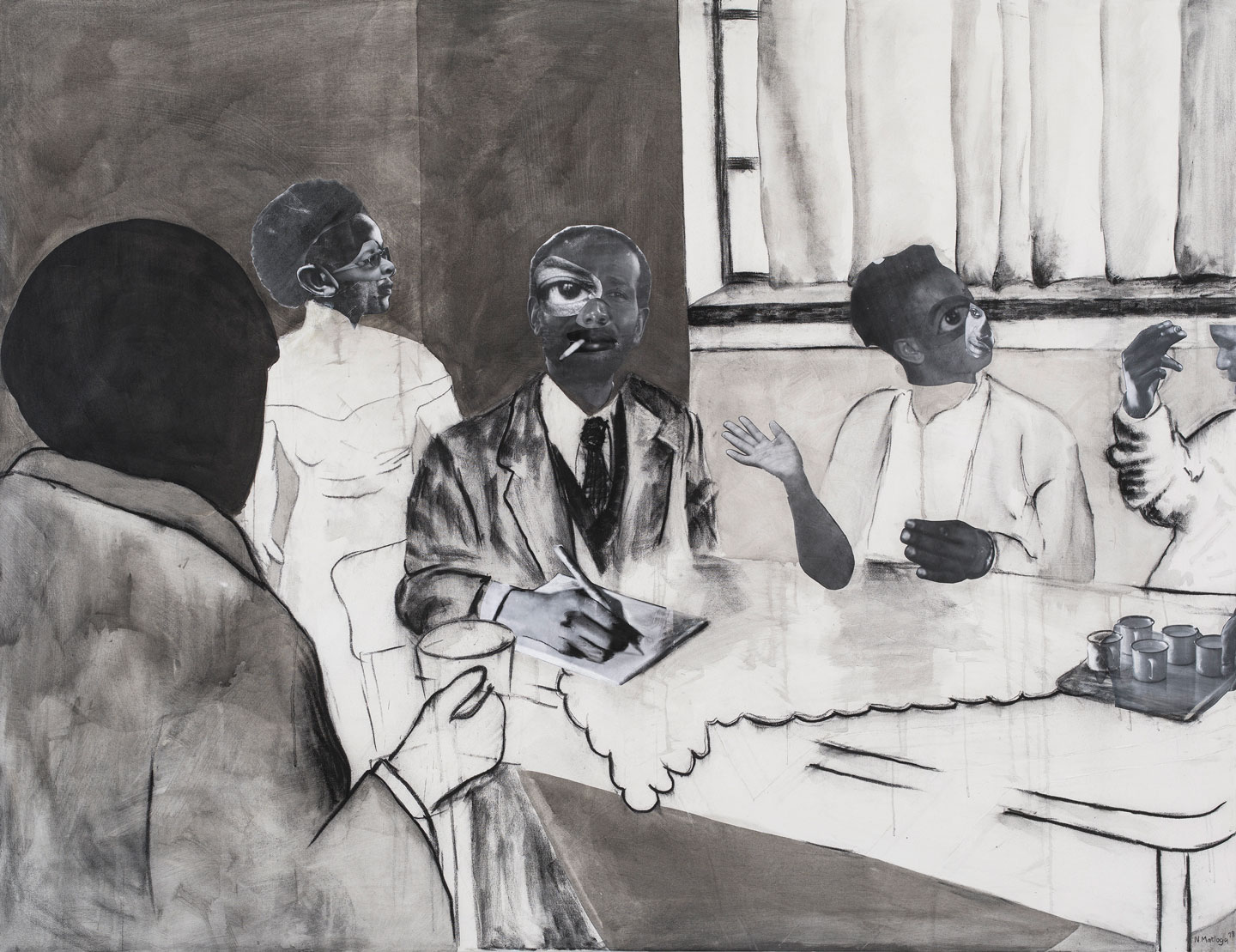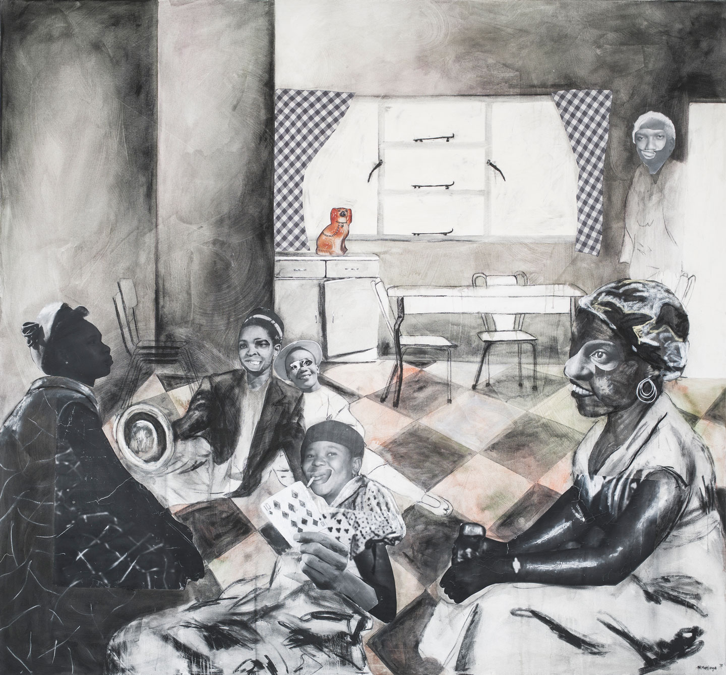 Neo Matloga works with drawing, painting and collage to make large-scale mixed media pieces on paper or canvas, depicting domestic scenes which capture memories of daily life during the artist’s childhood. These monochromatic works play with surrealism and perspective, pushing light, shadow and line to the edge of abstraction. The artist’s practice is a meditation on the healing properties of family and home, showing fragments of happiness and togetherness in the midst of struggle, and the new hope which was emerging at the time – hope for a democratic future after the end of Apartheid.