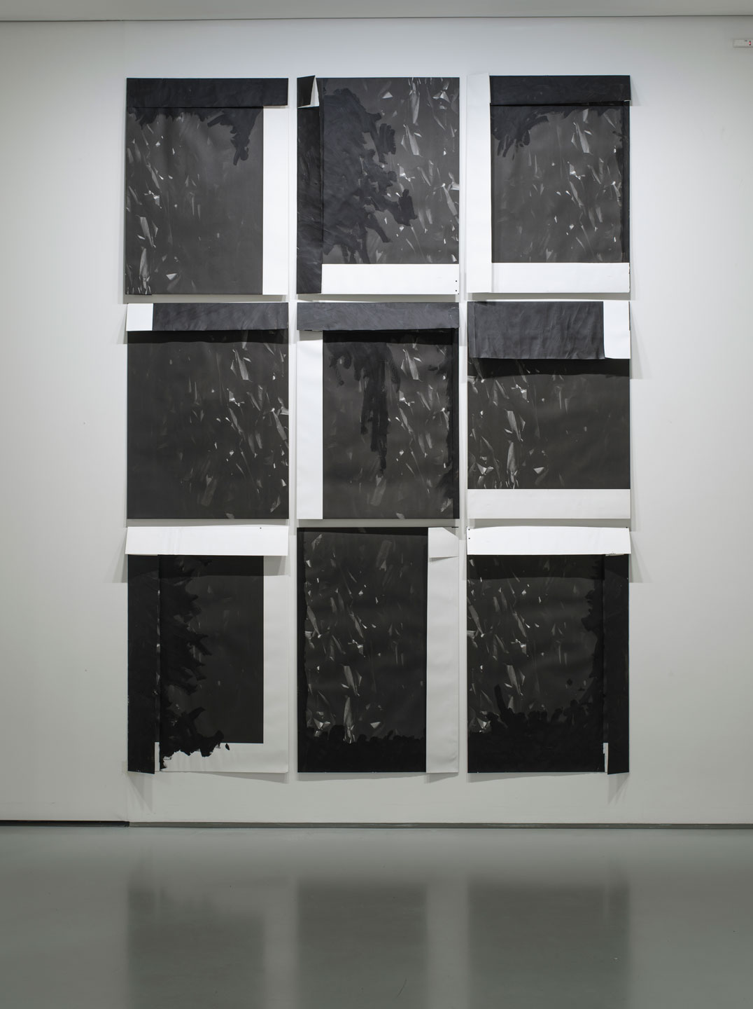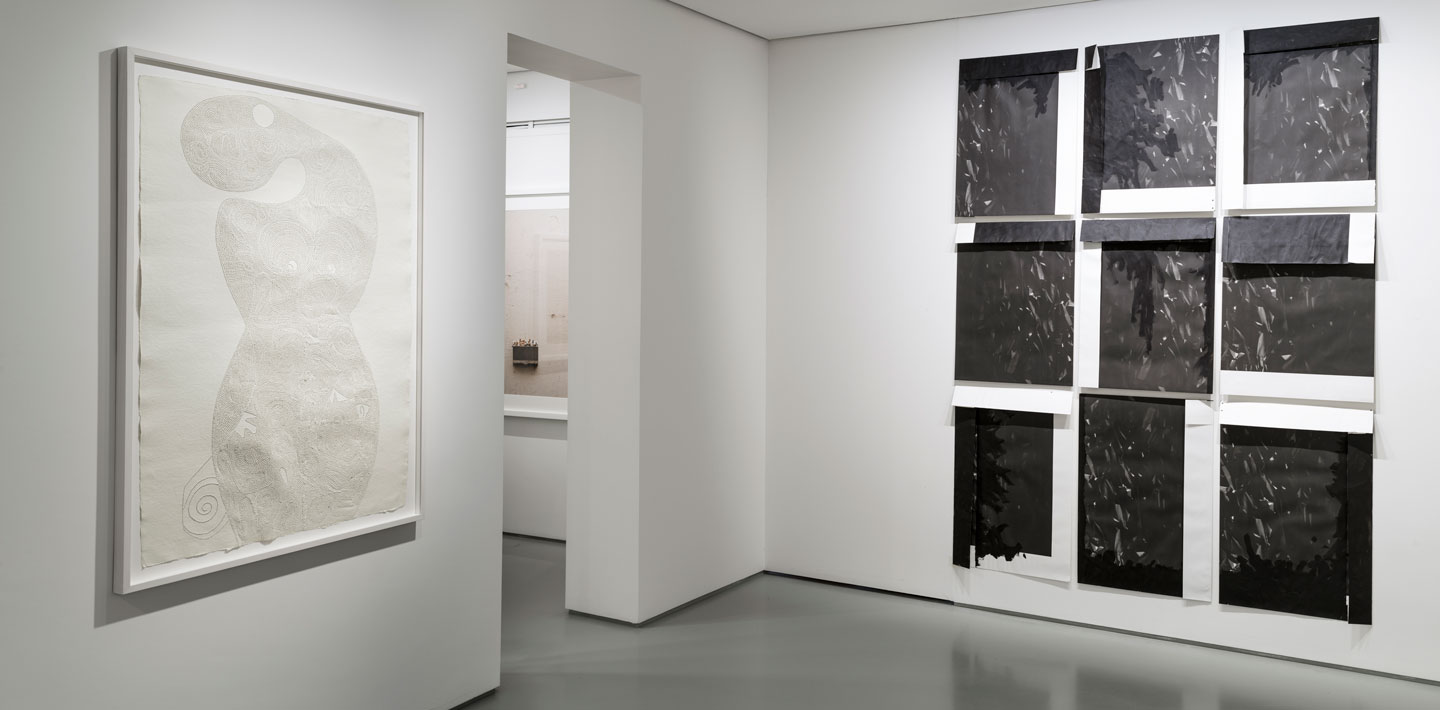 Paper and textiles are recurrent elements in Joël Andrianomeariso’s work; split, folded, creased and woven, he creates a myriad of compositions from his materials. In Passion Labyrinth (2014), Andrianomearisoa creates a three-line grid of fragile folded black paper. The different folds of the paper overlap, blend and contrast, creating a fluid enquiry into the notions of fantasy and reality, emotion and truth; the varied textures and monochrome, repetitive nature of the work invoke a multitude of meanings and emotions.