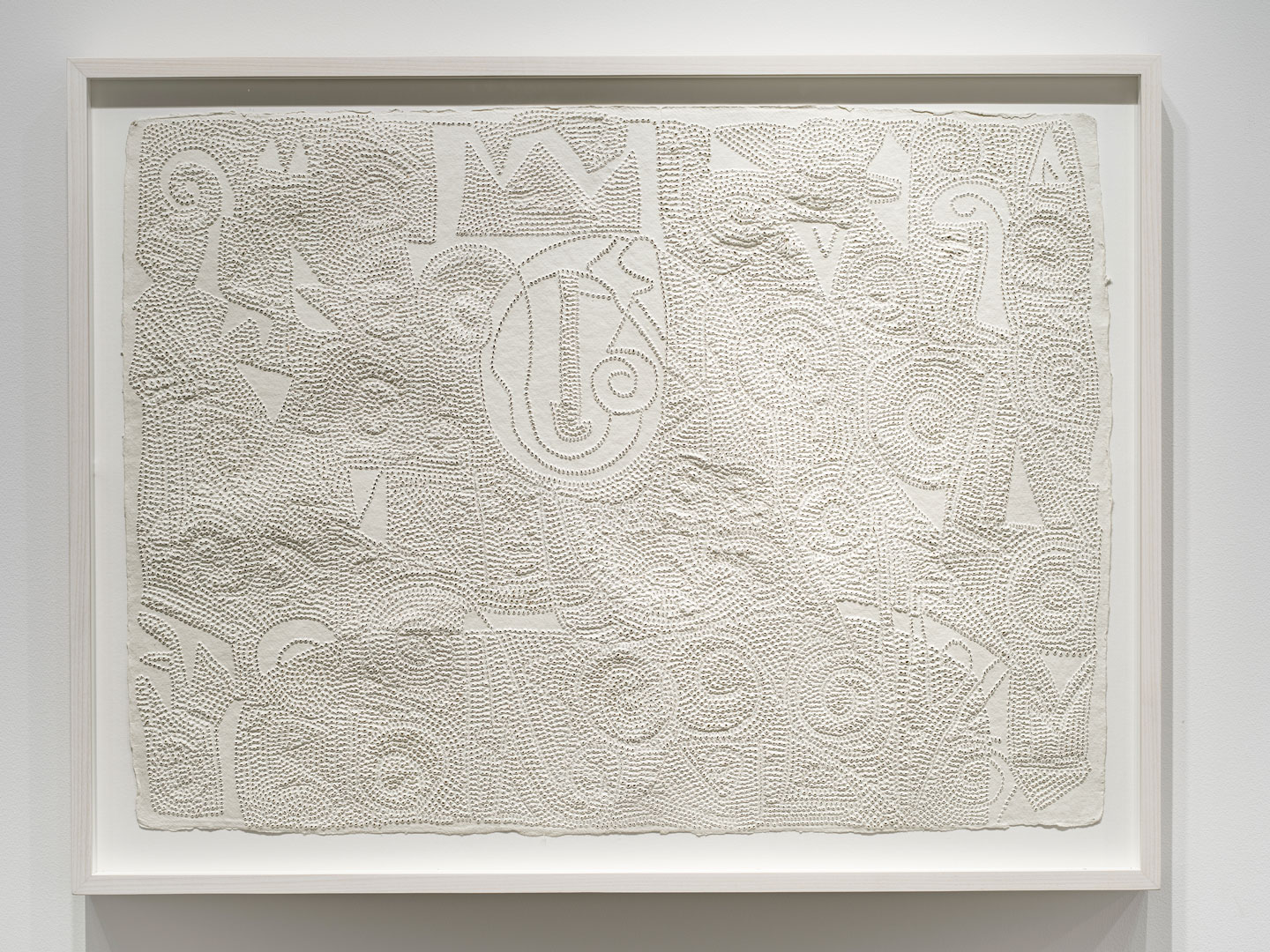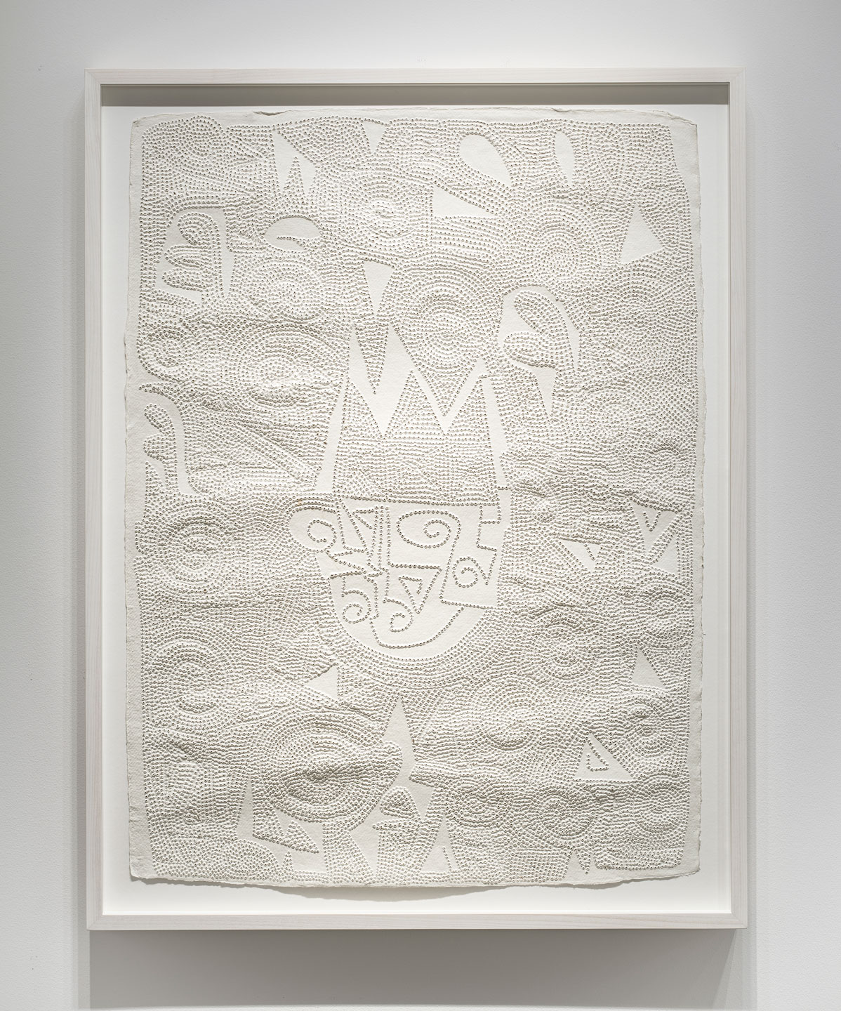 Hailing from the historic seat of the Benin Empire, Victor Ehikhamenor draws inspiration from the dual aesthetic and spiritual traditions which infused his upbringing, using imagery and symbolism from both Edo traditional religion and Catholicism. His signature is the use of semi-abstract patterning which creates a hypnotic experience, a sense of both meditative repetition and an ongoing narrative being told. Storytelling is an important element of his practice, whether the magic realism of memory and nostalgia, or biting criticism of history and politics. The unique perforated works on paper commissioned for the show, including The Palace Singer as a Historian (2017), reflect this preoccupation, referencing political issues in Nigeria both contemporary and historical.